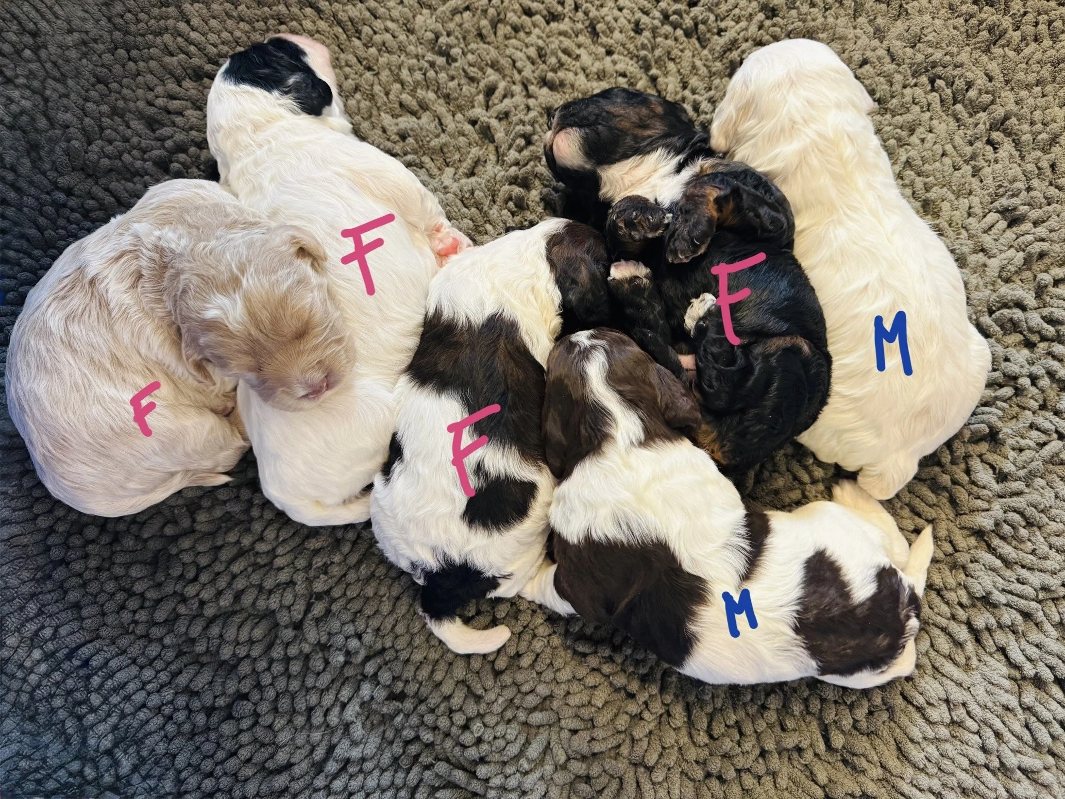 Rosie our F1 cockapoo had 8 adorable puppies on October 23rd. She has 4 Males and 4 Females in all different colors! Her puppies will be around 15 lbs full grown. Rosie has an amazing sweet calm temperament and loves everyone. We have a couple spots left on her waitlist. They will be ready to go home December 20th.